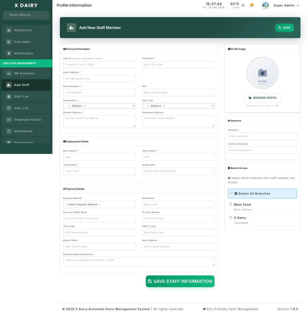 The Human Resource Registration module is used to add new staff and manage their job, salary, and access details.