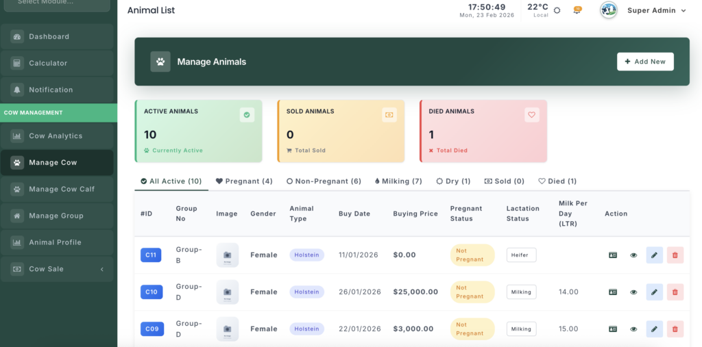 - Lactation Status — Change a cow’s production stage (Milking, Dry, Heifer) directly from the list.