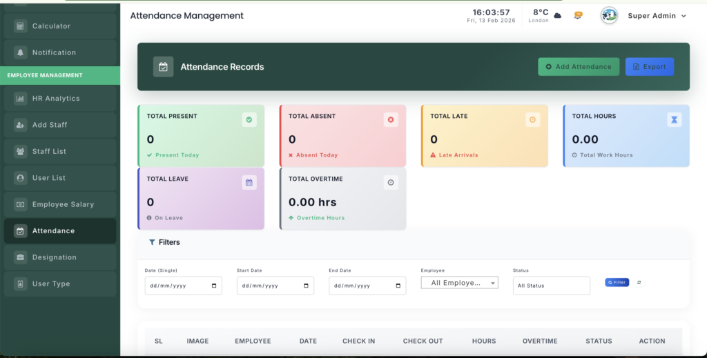 The Attendance Management module helps monitor staff presence, working hours, and real-time attendance status.