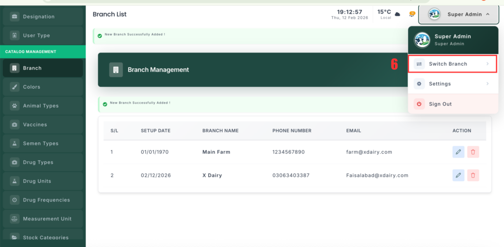 💡 Each branch operates independently — reports, animals, and transactions display only for the active branch.