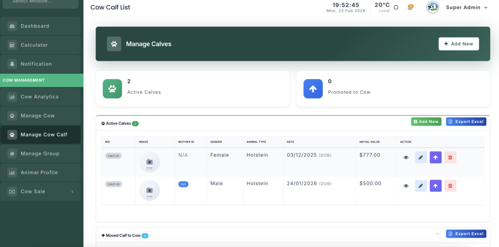 The Calf Management module allows you to track young animals from birth until they join the main herd as cows. It provides specialized tools for monitoring growth, feeding, and medical history.