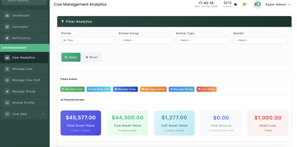 The Cow Analytics module provides a comprehensive dashboard to monitor your entire herd at a glance — including animal counts, financial performance, lactation status, and visual insights through interactive charts.