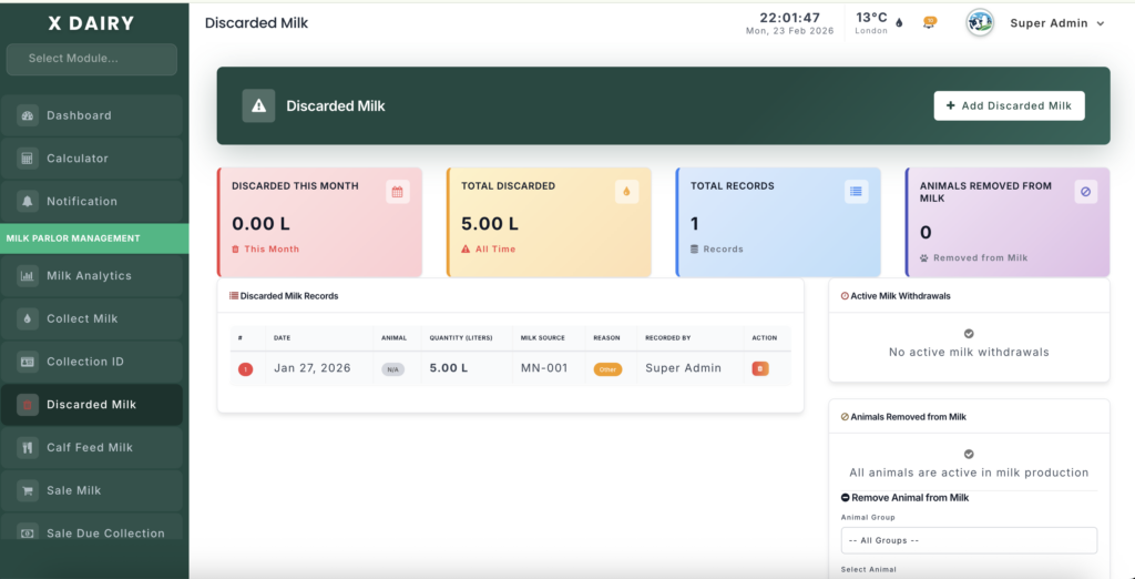 The Discarded Milk module helps you track milk that cannot be sold or used due to health issues, contamination, or safety concerns. Proper monitoring allows you to reduce losses and improve farm health management.