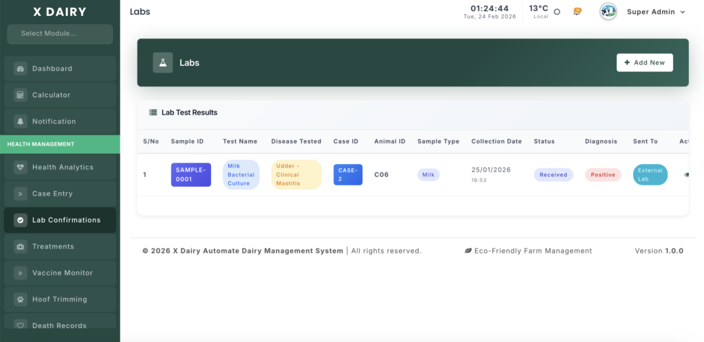 The Lab Confirmation module records and tracks laboratory test results for livestock. It ensures diagnoses are scientifically verified, allowing for accurate treatments and improved herd health management.