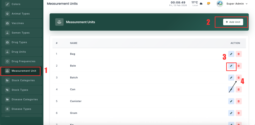 The Measurement Units Management section allows you to manage standard units used for feed, supplies, and inventory (such as Bag, Kg, Gram, Bale). These units help keep records consistent across the system.