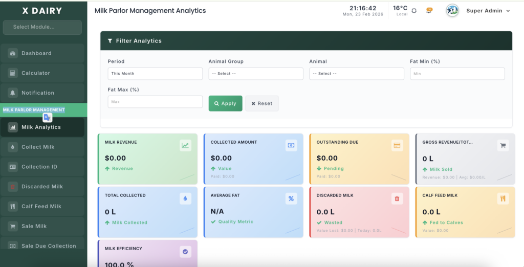 The Milk Analytics dashboard provides a high-level overview of your farm’s milk productivity and financial performance. Use this module to monitor efficiency, identify losses, and optimize milk production.