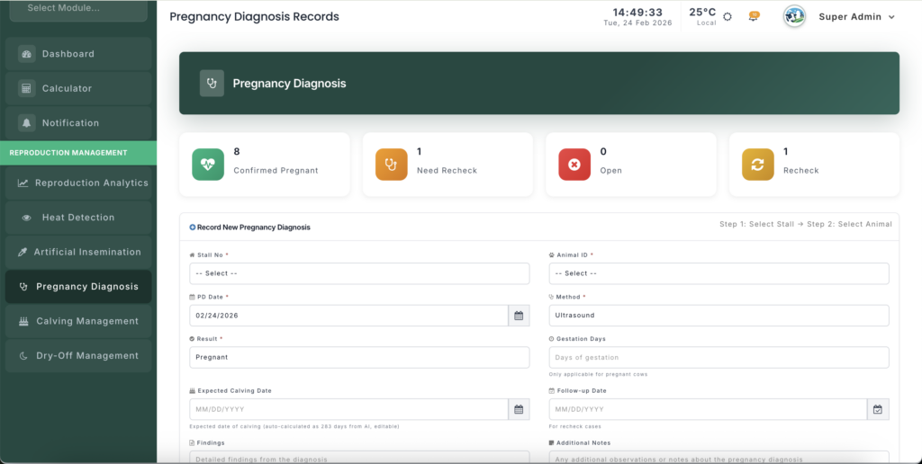 The Pregnancy Diagnosis (PD) module is used to confirm whether breeding activities (Artificial Insemination) were successful.