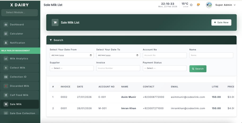 The Milk Sales module allows you to sell collected milk, manage customer transactions, and track payments and invoices efficiently.