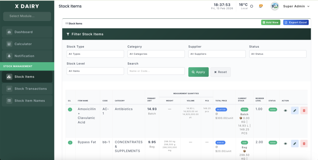 The Stock Item Management module is the core inventory system for the farm. It ensures accurate stock control, consistent item naming, and advanced unit tracking.