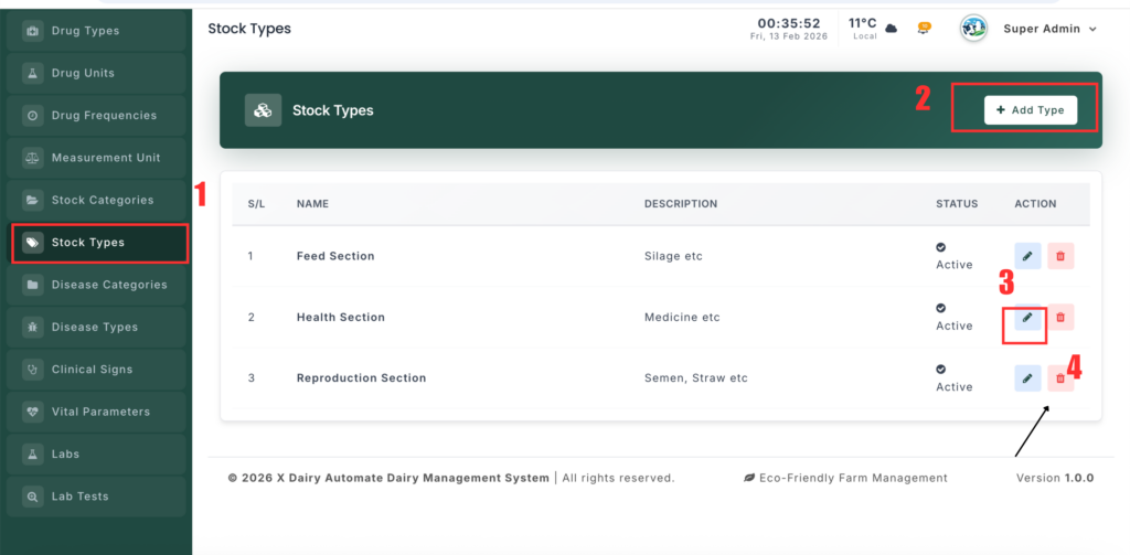 The Stock Type Management module is used to define the highest level of inventory classification such as Medicine, Feed, Equipment, Consumables, etc. These types act as parent groups for Stock Categories and help keep the inventory system well organized.