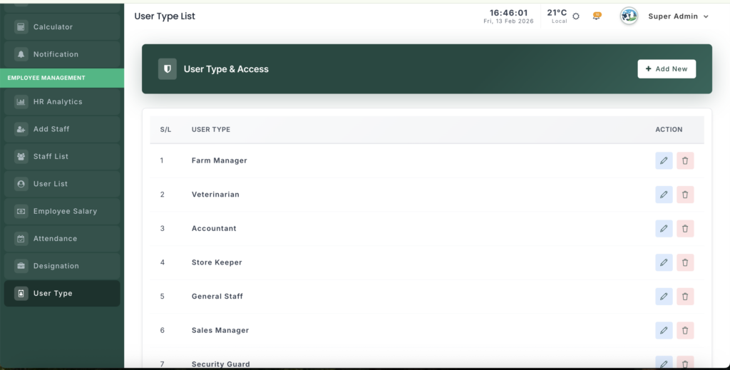 The User Type Management module helps you create and control different system user categories (such as Admin, Manager, Accountant, Staff). These user types decide what features a user can access in the system.